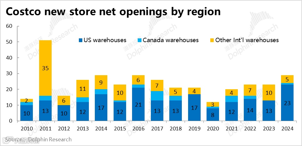 历史上看,2010年后除2011一年外,Costco在非美国&加拿大地区的开店数量,一直明显少于美国本土的新开门店数量,每年也不超过10家。换言之,Costco在拓店时是优先考虑在成熟的北美加密门店数量,而非海外快速开拓新市场。 换言之,指望Costco明显加速海外开店节奏,拉动业绩增长的可能性也不大。
