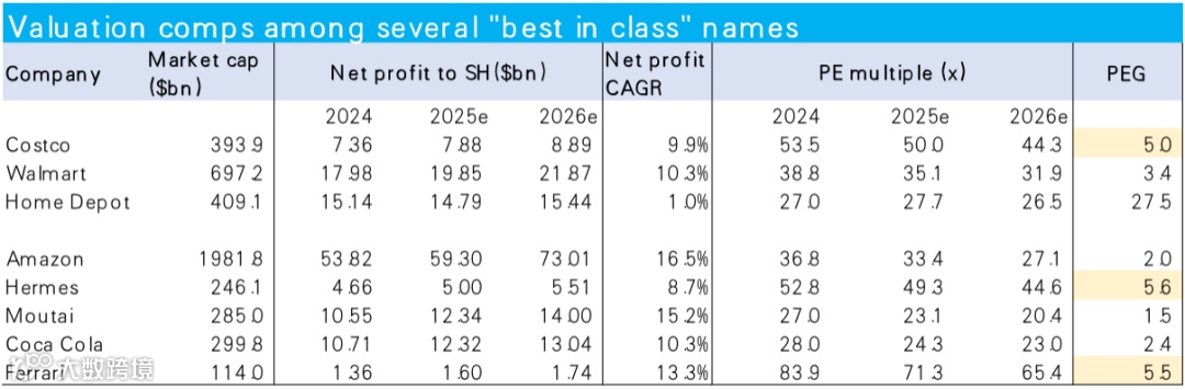 经业绩增速调整后的PEG指标,除Home Depot因利润CAGR过低导致PEG异常外,也仅有Costco、Hermes和Ferrari这三家的PEG也都“巧合”的高于5x。