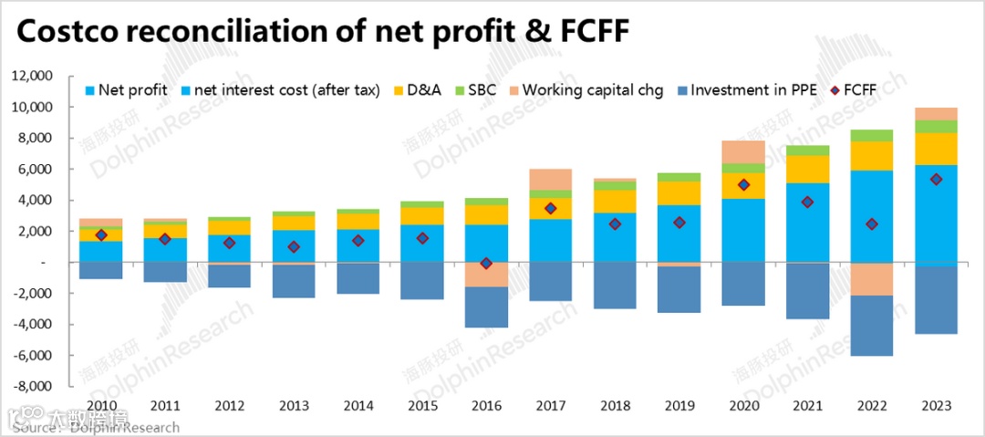 从下图2010~2024财年的Costco的现金流可见,Costco的自由现金流并没有明显且稳定的高于财务净利润,相反大多数年份Costco的自由现金流反而是的低于财务净利润的。几个影响现金流的关键项目上,Costco历年的摊销和折旧普遍低于固定资产投资,反映了Costco自建物业重资产模式下持续的capex投入需求。而运营资金变动也并没贡献持续的现金流入,说明Costco同样没有持续从供应链或消费者占款的情况。换言之,Costco并不属于现金流的角度估值明显更便宜的情况。