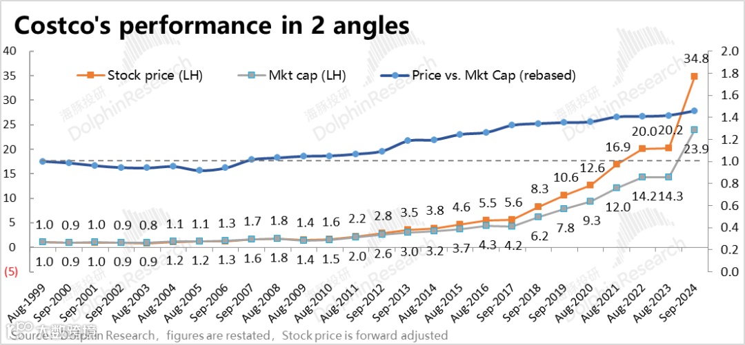 由下图可见,1999财年到2024财年间,Costco的市值增长了近24x,但股价(前复权)则是增长了近35x,换言之,持有Costco股权的收益,实际比公司总市值的涨幅要高出约46%,这个数字实际就粗略的反映了自1999年以来Costco股东除资本增值以外的股东回报。