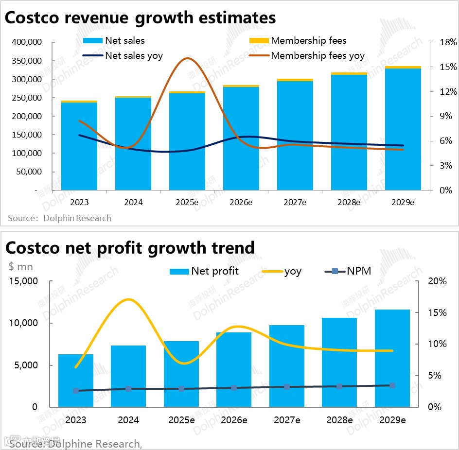 盈利预测上Costco的业务模型比较简单,收入端主要由新增门店数量和老店同店销售增速两个关键指标影响。更具体来看,新开店节奏依赖公司的指引,不容易提前判断,但好在历史上开店节奏平稳,不会有太大波动。