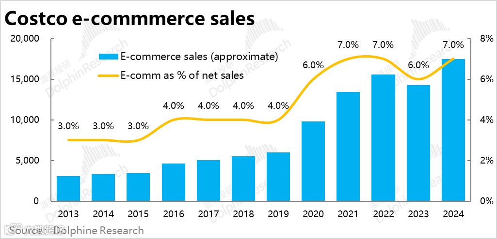 虽然线上化仍算的上一个增长方向,但从历史上看疫情前Costco的线上销售占整体的比重近10年间一直仅在3%~4%左右徘徊,可以说并无起色。疫情爆发的2020年,Costco由于线下隔离,被迫增加了在线上化的投入、并于当年以$10亿收购了Innovel solutions(一家末端配送物流公司)以充实线上零售所需的履约能力。同年Costco线上零售的占比跳跃式增长到了约6%。