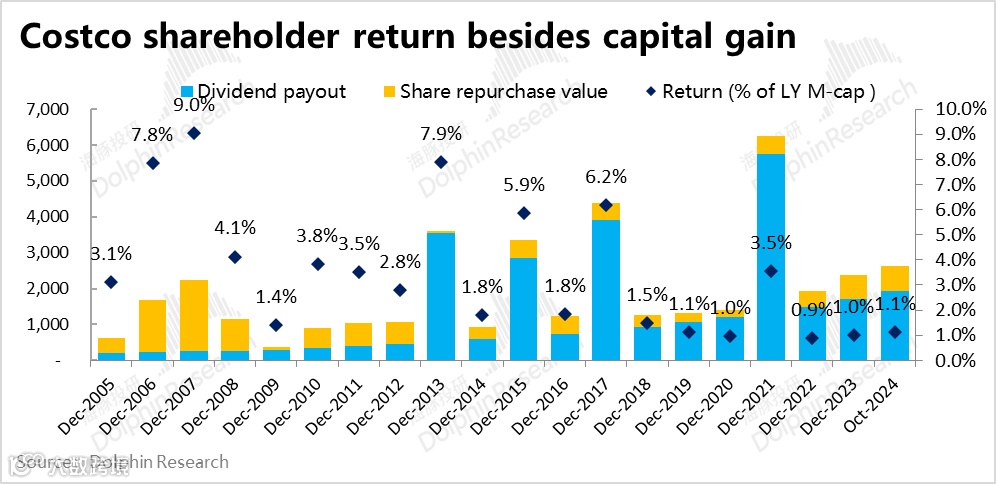 净利润和现金流角度估值都“高高在上”,那么股东回报角度Costco又有没有出众之处能解释如此高的估值?