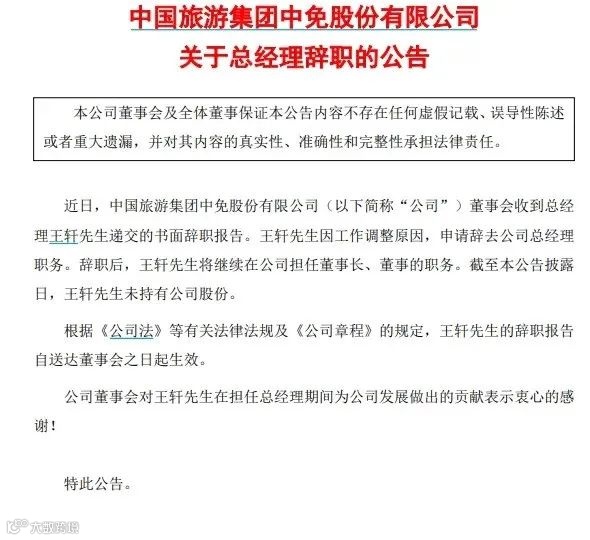 中国中免公司总经理王轩因工作调整原因递交辞职报告,将辞去总经理职务,但将继续担任公司董事长、董事。截至公告披露日,王轩未持有公司股份。根据相关法律法规及公司章程规定,辞职报告自送达董事会之日起生效。