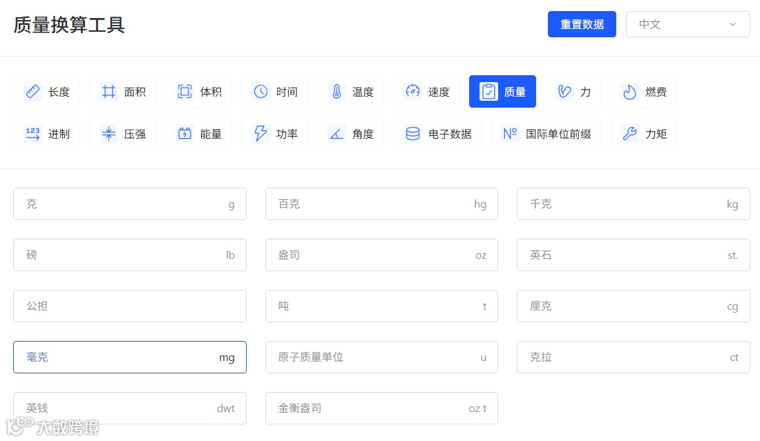 为了帮助用户快速准确地理解和转换这些单位,大数跨境推出了实用的质量单位换算工具,为跨境工作者和专业人员提供了便捷支持。