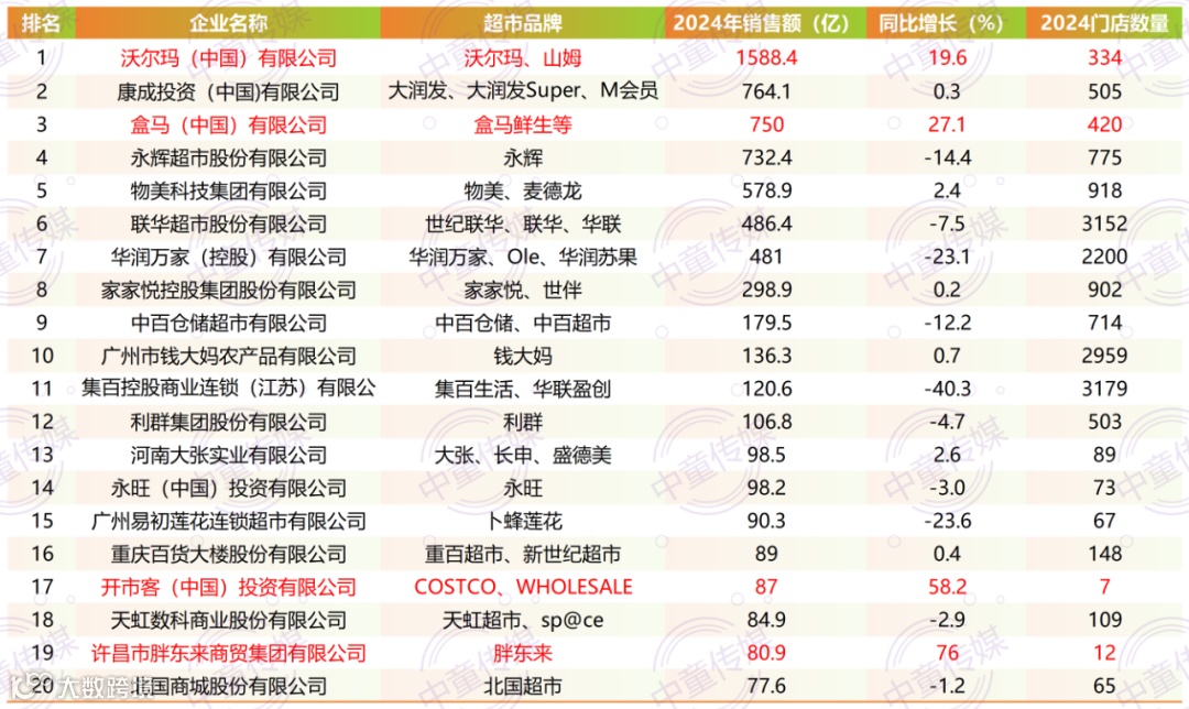 根据《2024年中国超市TOP100》榜单数据显示,在整体经济增长承压背景下,盒马、沃尔玛、开市客、胖东来等企业实现逆势增长。其中区域零售标杆胖东来以76%的同比销售额增长率成为行业亮点。