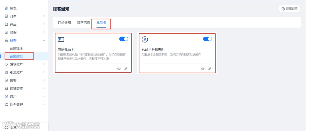 4、商家可以在顾客—顾客通知,来管理礼品卡的邮件发送模板。