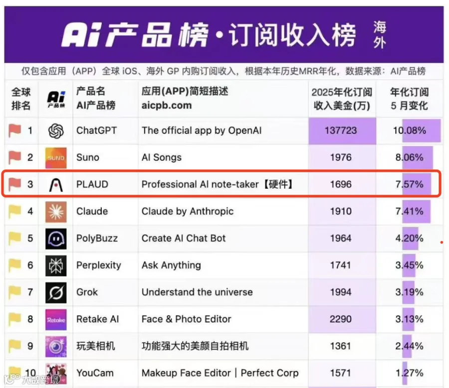 Plaud 更是跃升 AI 产品榜第三,订阅 ARR 达 1696 万美元,MAU 用户超过百万,成为订阅增长最快的产品之一。