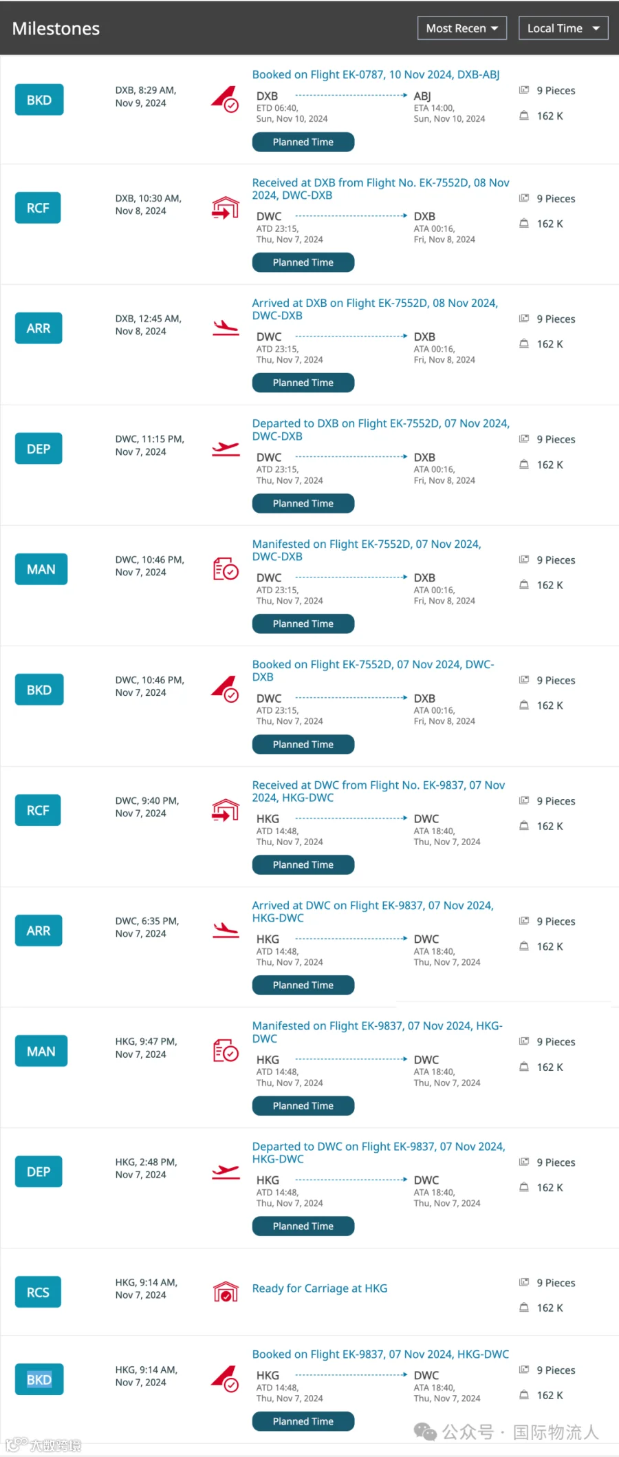 在航空公司网站上使用单号追踪功能时,会看到一列名为Tracking Process的状态码(如BKD、RCS、RCF、MAN、DEP等),这些代表了货物的运输进度。以下是主要状态码及其含义说明: