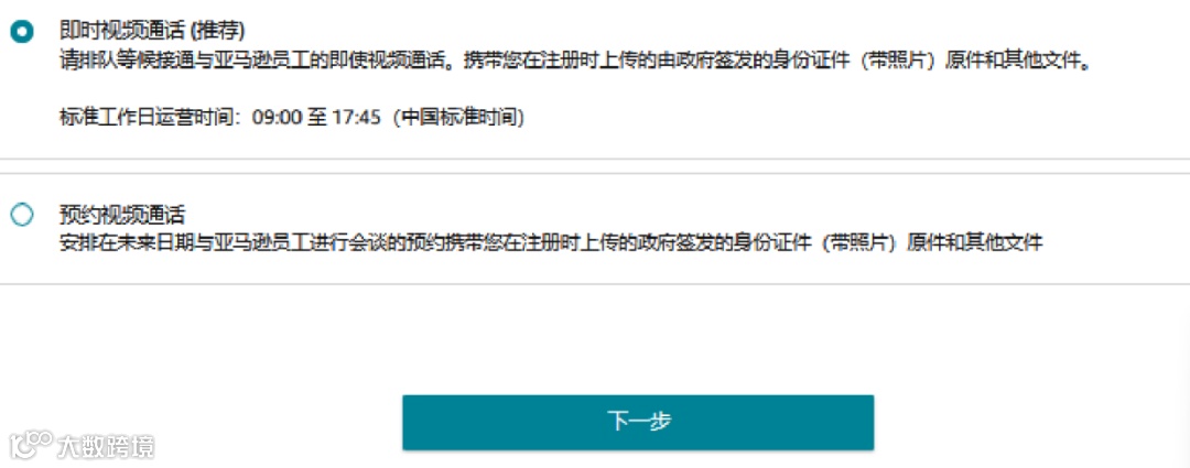 第一种如图所示“即时视频通话”,您可以立即开始排队等候接通于亚马逊员工的视频通话,无需预约。