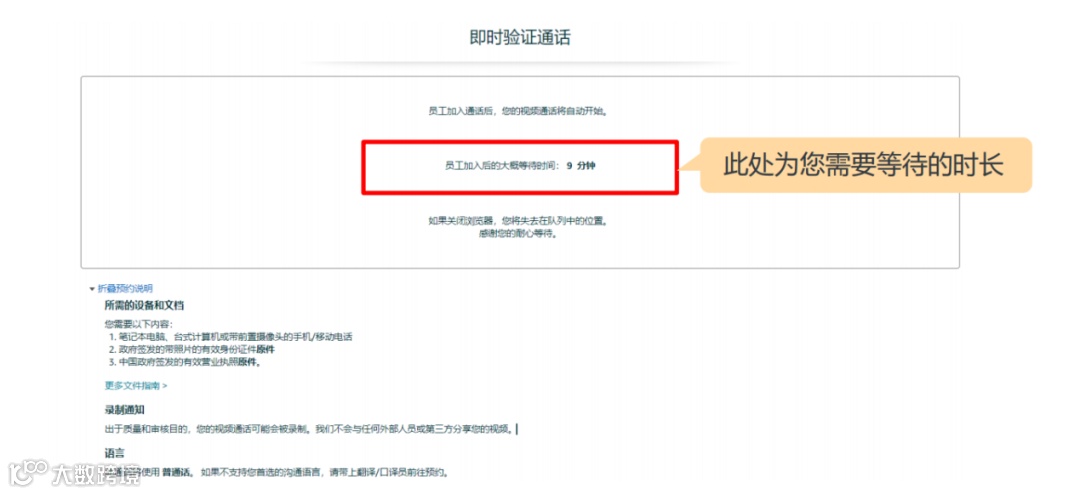 在确保资料已经准备齐全后,请点击“加入通话”按钮开始排队等候视频通话。