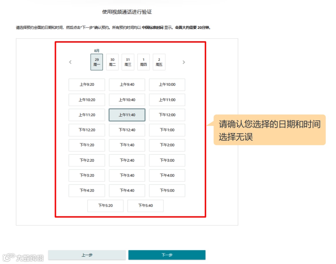 预约视频通话:请选择一个日期和时间,并单击“下一步”确认您的视频通话验证预约。