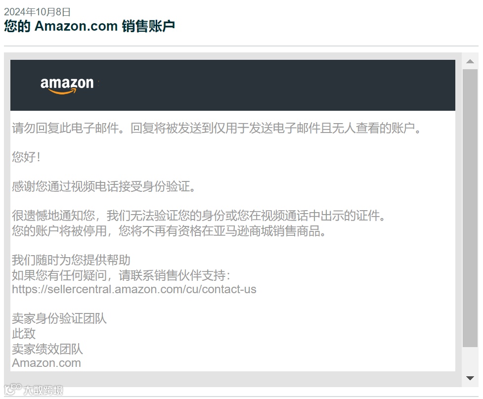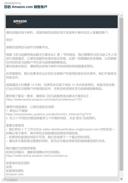 但最近亚马逊出现了一种5分钟视频验证,并且这封邮件亚马逊只会发在邮箱里面,如果卖家不仔细查看,很有可能错过这封邮件。