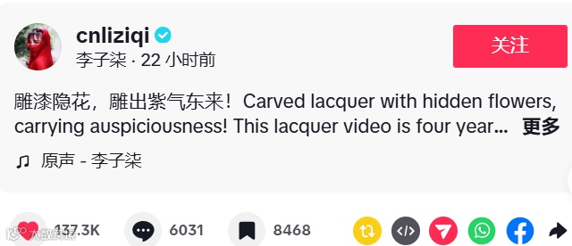 作为曾经火遍海内外的头部博主,李子柒以其独特的“中国风”视频内容赢得了全球观众的喜爱。此次回归,她发布的《雕漆隐花,雕出紫气东来》和《拿柴房造了一个森林衣帽间》两条视频,再次展现了她标志性的“中国风”与高质量的制作水准。