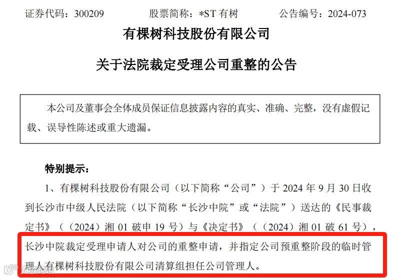 近日,业内消息称,深圳市有棵树科技股份有限公司(以下简称“有棵树”)被长沙市中级人民法院(以下简称“长沙中院”)裁定受理重整申请,正式步入重整程序。