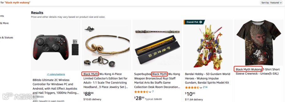 从目前搜索结果上看,部分卖家已上架紧箍圈、指环项链、金箍棒、游戏手柄、主题T恤等产品,并在标题中明确写着“Black Myth”。