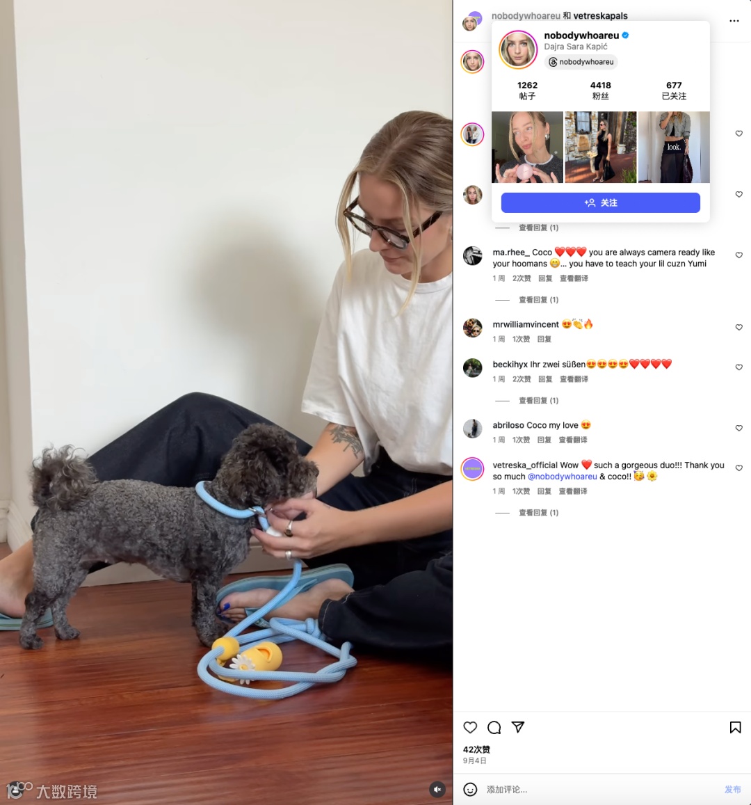 其实,Vetreska之所以不局限于合作宠物垂类博主,因为它的产品不仅是给猫狗用的,也是家居乃至于穿搭的一部分,这样的跨界合作能触达更广泛的受众群体。