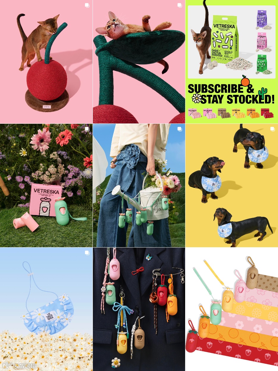 在Instagram和TikTok上,Vetreska的内容几乎都是场景化呈现:阳光、绿植、舒适的家居空间,宠物在其中玩耍,旁边点缀着仙人掌爬架或水果造型猫砂盆。
