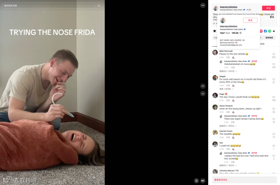 根据第三方平台Marketing Brew的数据显示,Frida 在TikTok上的原生视频内容的自然观看量已经突破 1.1 亿次。这种无需大量广告投放的自然传播,不仅降低了营销成本,还让品牌形象更加真实可信。