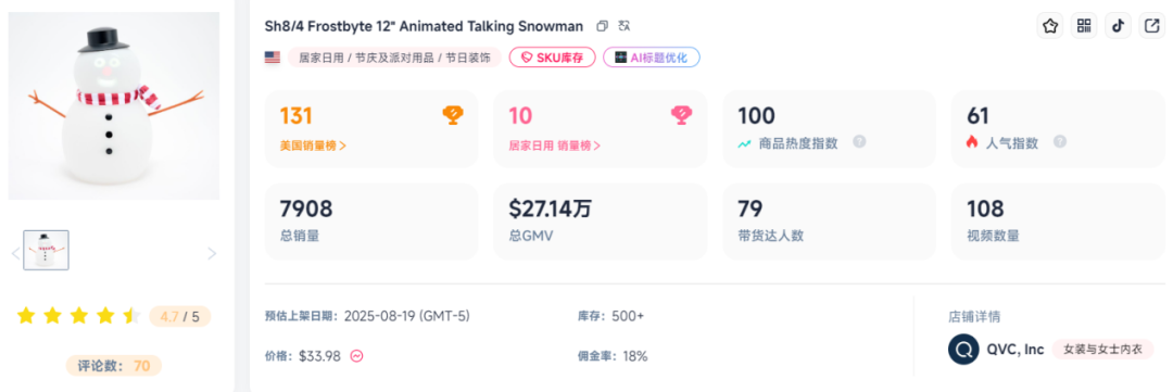 圣诞装饰塑料雪人销售火爆 图源:FastMoss