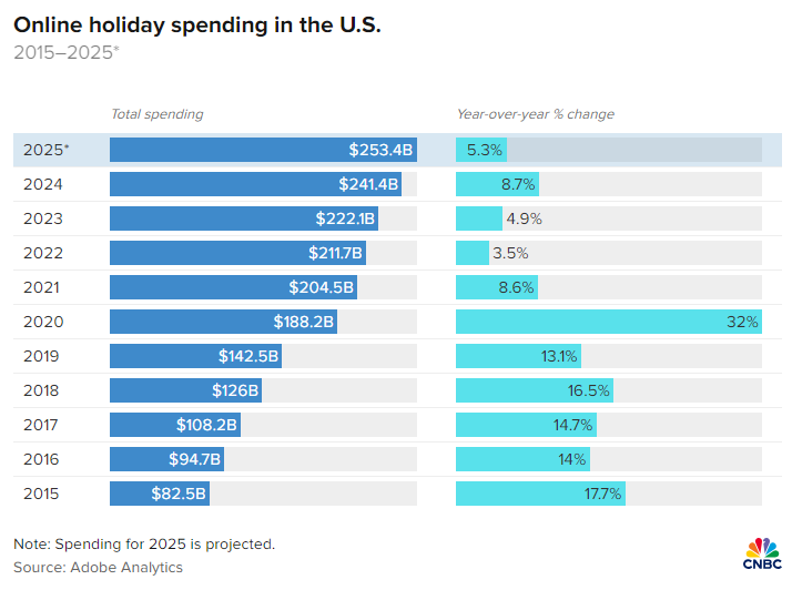 市场分析机构Adobe Analytics的报告则指出,随着消费者愈发青睐折扣促销,加上AI助推消费需求对接,预计今年美国假日季在线消费额(11月1日至12月31日)将同比增长5.3%,达到2534亿美元。