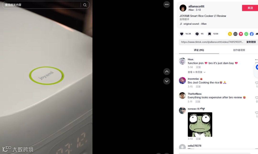 TikTok博主@allanscottt发布的一条关于智能电饭煲的视频,播放量达24万次,点赞达1.43万。通过“午餐3分钟搞定”的真实使用场景演示产品便捷操作,并以“白噪音级静音”“自动保温”等关键词强化产品卖点。