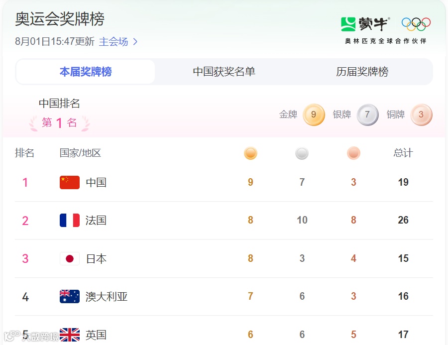 截至北京时间2024年8月1日下午3点,中国代表团在巴黎奥运会上以卓越的表现斩获了9枚金牌、7枚银牌及3枚铜牌,总计19枚奖牌,稳居奖牌排行榜第一。