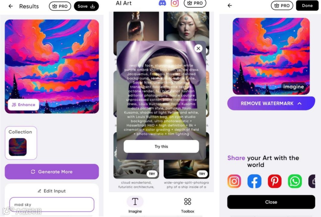 笔者输入了“mad sky”,选择油画风格,大家可以看到最后效果还是很不错的~还有[inspiration]灵感模块,参考制作好的艺术图片的关键字,为自己的作品提供灵感。另外,相比Midjourney强绑定Twitch,Imagine覆盖的C端群体更为广泛,分享平台几乎囊括了所有主流社交软件和Twitch。