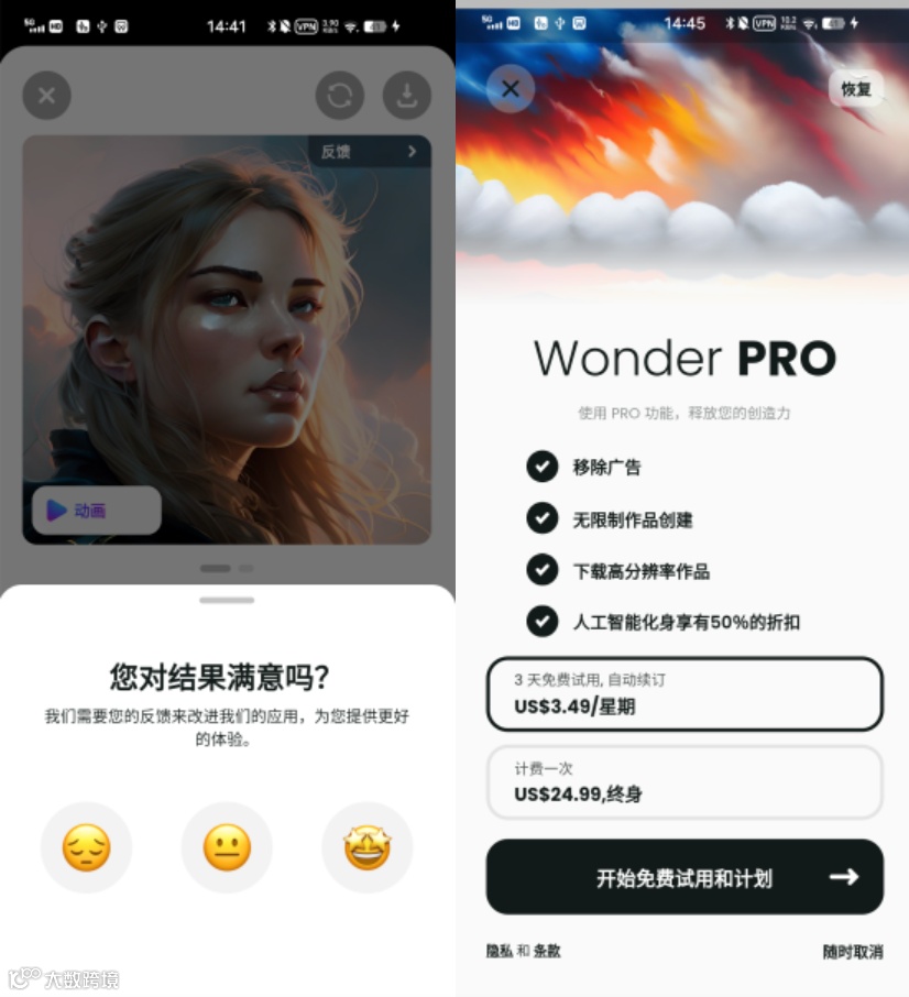 相比Imagine的不同之处在于,多了App Store版本,在中国地区多了汉化版。值得一提的是,在生成图片之后Wonder会弹出反馈对话框,用于帮助AI学习。另外相比Imagine$39.99/年的订阅价格,Wonder$24.99的终身订阅价格具有明显优势,这或许也是Wonder会在月流水和下载量上胜出的原因之一。