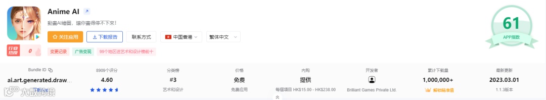 除了这两个冠亚军之外,还有许多脱颖而出的选手。例如这款Anime AI,仅能将文字转化成二次元风格图片,相比前两者就更加垂直专注二次元群体。去年12月发布Google Play版本(无App Store版本),截至目前上线仅3个月就已经在99个地区进入“艺术和设计”榜前10名。但遗憾的是月流水仅6k+美金。