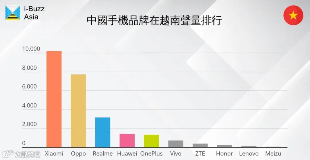疫情恢复后,越南2021年手机市场有12% 的成长率中,中国有近50%的市占率。小米及OPPO为声量冠亚军,vivo虽然在越南市占率为第三,但声量排第六。小米2017年进入越南市场,价格便宜、高配置,现已成为最受欢迎的中国手机品牌,OPPO于2013年进入越南,位居第二。vivo于2015年底进入越南市场。中国手机目前在低价手机市场占主导地位,小米主要优势为价格,而OPPO主要优势为手机外形与相机功能。
