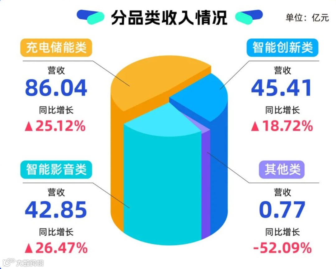 具体来看,在产品结构方面,安克创新的三大产品线均表现出色。其中,充电储能类产品成为最大亮点,营收高达86.04亿元,占比近半。智能创新类和智能影音类产品也分别实现了45.41亿元和42.85亿元的营收,共同构成了公司的业务基石。