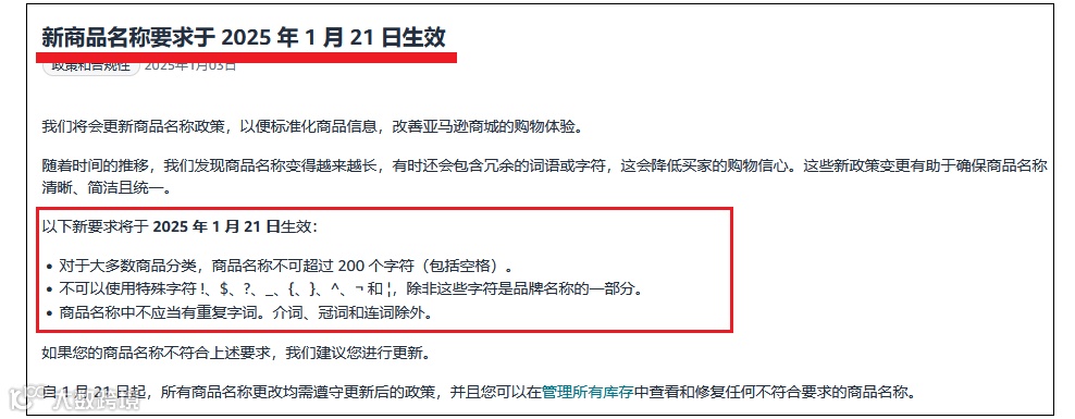 据最新亚马逊宣布:新商品名称要求将于2025年1月21日生效,还剩下两周的时间。