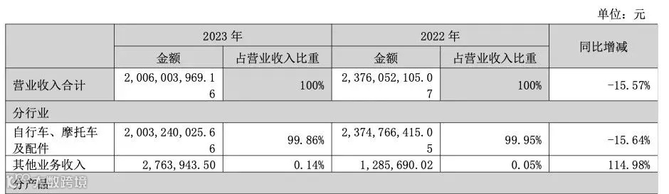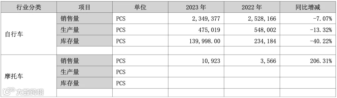 2023年,自行车销量达到235万量,同比下降7.07%。摩托车销量1.09万量,同比增加206.31%。