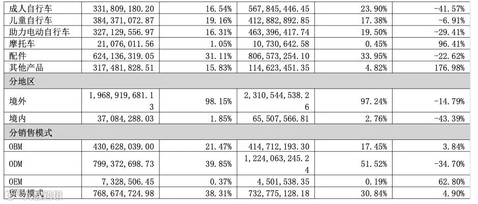 分产品构成来看,2023年,儿童自行车、成人自行车、助力电动自行车和摩托车是公司最重要的产品线。其中,儿童自行车、成人自行车、助力电动自行车收入均超过3亿元。