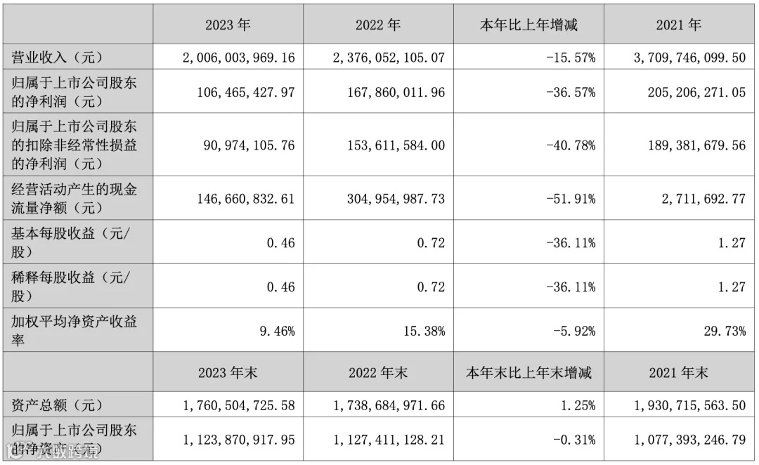 2021年-2023年,久祺股份实现营业收入分别为37.10亿元、23.76亿元和20.06亿元,归属于母公司所有者的净利润分别为2.05亿元、1.68亿元和1.06亿元。
