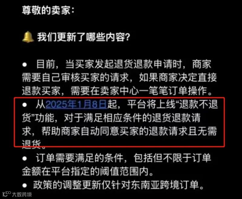 近日,有卖家反映称,为了简化退货流程,鼓励更多消费者在平台上消费,TikTok Shop平台计划从2025年1月8日,在东南亚市场上线退款不退货功能。