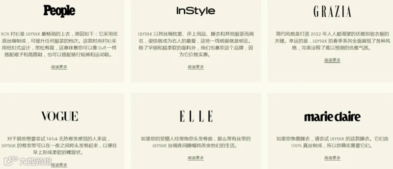 Lilysilk的这条路走对了,慢慢地在法国市场站稳了脚跟,为它打开了国际化的大门。随后品牌加速布局,通过亚马逊、eBay等第三方电商平台,将业务扩展到英国、德国等地。Lilysilk还通过自建品牌独立站,将中国丝绸带到更多消费者面前。目前,Lilysilk在英国、法国、意大利等地设立了14个官方站点,并多次获得《VOGUE》《ELLE》等国际知名杂志的推荐。