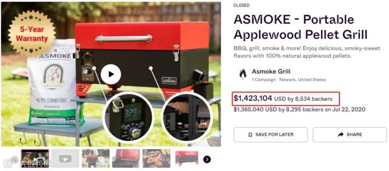 先来看Asmoke在市场上的精彩表现,它的首款产品是通过Indiegogo众筹平台成功面市的,最终成功筹集到了142万美金;随后,Asmoke又在Kickstarter上发布新品智能颗粒烤炉“Essential”,首日便获得了23万美金的众筹金额。同时,Asmoke还赢得了资本的青睐,截至目前已经完成两轮融资。