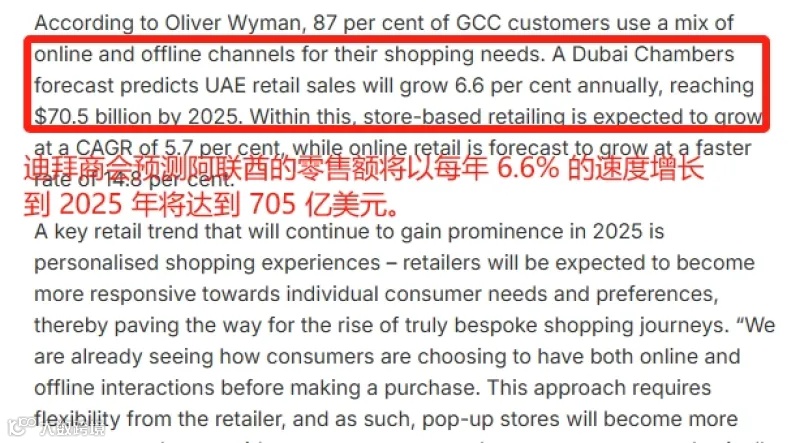 日前,迪拜商会预测道,预计阿联酋电商市场的零售额将以每年6.6%的速度增长,到 2025年将达到705亿美元。其中,实体零售的复合年增长率预计为5.7%,而在线零售的复合年增长率预计为14.8%。