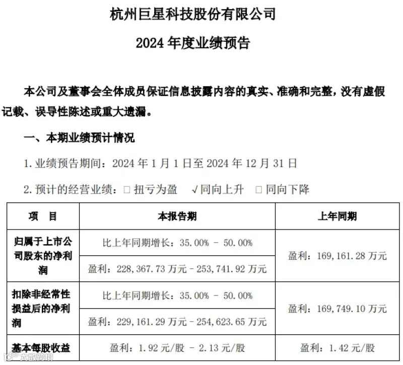 最近,巨星科技披露了2024年度业绩预告。报告显示,预计全年归母净利润22.84亿元-25.37亿元,同比增长35%-50%;扣非归母净利润22.92亿元-25.46亿元,同比增长35%-50%。