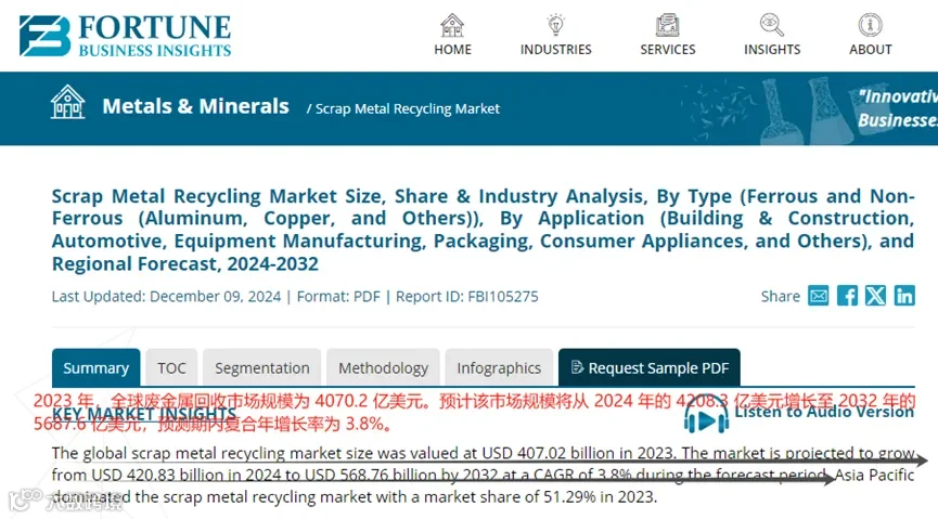 近年来,全球基建市场的迅猛扩张促进了机场、港口、发电厂等基础设施建设的蓬勃发展。这一趋势不仅激发了基建投资的热潮,还极大地推动了废弃金属回收行业的快速增长,一系列新的商业机遇正不断涌现。据Fortune Business Insights的数据显示,到2024年,全球废金属回收市场的规模已经达到了4208.3亿美元,并且预测该市场将在2032年进一步增长至5687.6亿美元,期间将保持3.8%的复合年增长率。废金属回收市场前景广阔 图源:Fortune Business Insights然而,在淘金热潮中,真正获益丰厚的往往并非盲目追随的淘金者,而是那些为淘金者提供必需物资,如水和铲子的小商贩,他们另辟蹊径,收获颇丰。废品回收领域的繁荣景象显而易见,但更令人瞩目的是其上游产业链中隐藏的更为可观的盈利机会。来自陕西的90后青年张强龙,凭借机械自动化专业的教育背景,敏锐地洞察到了这一潜在机遇。他智慧地意识到,在废弃资源的循环利用过程中,各类材料处理设备是不可或缺的。以废旧电线电缆的回收加工为例,这一过程不仅需要铜回收专用的铜米机,还离不开塑料粉碎机等设备。更重要的是,相较于回收行业本身,“回收机械设备领域的竞争相对较小”。张强龙团队设计推出“迷你”款铜米机 图源:天下网商于是,2016年,张强龙从外贸销售的岗位辞职,前往机械制造业大省浙江,希望能找到一家机械生产厂商展开合作,一起做“回收服务业务出海”。尽管创业初期面临种种困难,但最终张强龙还是找到了一家有合作意向的机械工厂,第一年,张强龙就通过阿里巴巴国际站帮工厂卖出去100多万元的电缆剪切设备。