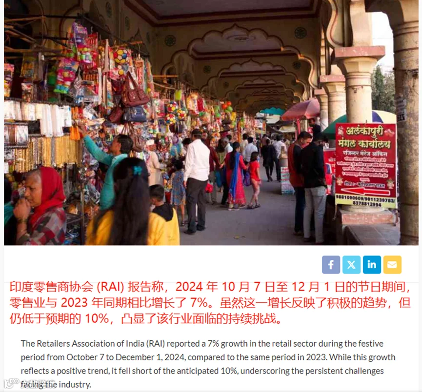 尽管印度电商的增长势头比较强劲,但它还是面临着一定的挑战。该国零售商协会(RAI)近期公布的一份报告称,2024年10月7日—12月1日的假日大促期间,印度零售业同比仅增长了7%,低于此前预期的10%。对此,印度零售商协会首席执行官Kumar Rajagopalan表示:“通货膨胀、竞争加剧以及中下阶层人口支出受限,是该行业面临的重大障碍。”