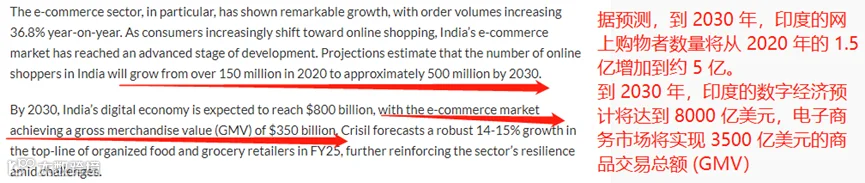 一份来自科尔尼研究公司的数据显示,印度电商市场正在持续增长,预计到2025年底,这一市场的估值将达到77.7亿美元。而到2030年时,印度的数字经济规模预计将达到8000亿美元,电商商品交易总额(GMV)也将增长到3500亿美元。