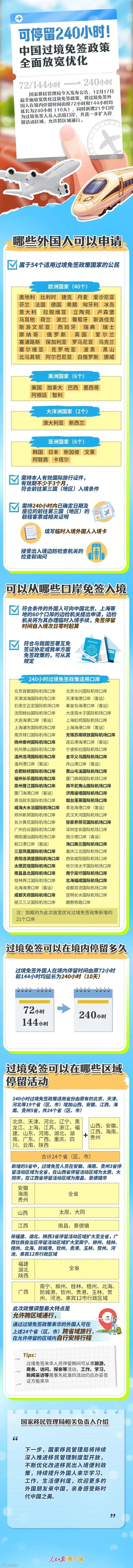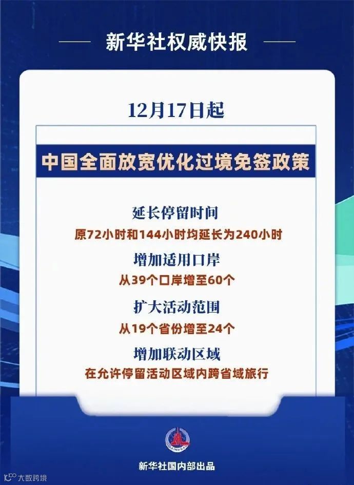 12月17日,国家移民管理局发布公告,即日起,进一步放宽优化外国人过境免签政策,延长过境免签停留时间,从原72小时和144小时统一延长至240小时;增加适用口岸,从39个入境口岸增加至60个;扩大停留活动区域,从19个省份增至24个省份,允许过境免签外国人在政策适用范围内跨省域旅行。其中安徽作为此次新增的省份,过境免签人员在安徽停留活动区域为全省。