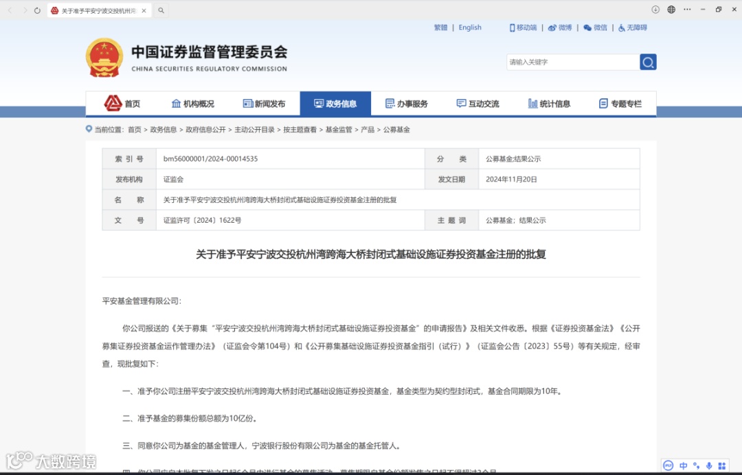 11月20日,平安宁波交投杭州湾跨海大桥封闭式基础设施证券投资基金(简称“平安宁波交投REIT”)取得中国证监会注册批文。杭州湾跨海大桥作为底层资产,将以基金的形式发行并上市交易。