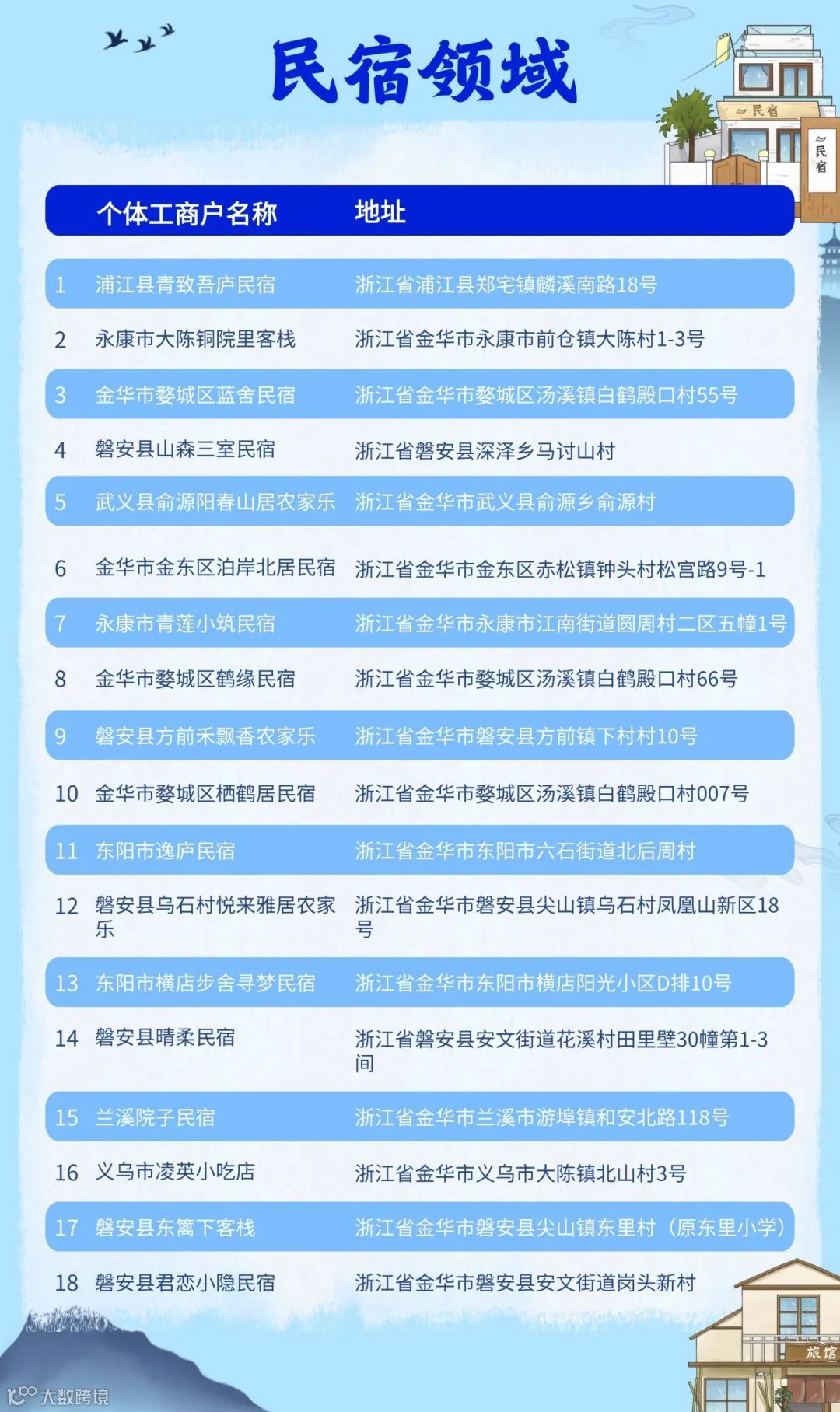 近日,首批浙江省个体工商户“浙个好”公共品牌名录发布,共218家民宿行业和112家非遗行业个体工商户入选,其中金华39家个体工商户上榜,上榜数量列全省第一。具体名单↓