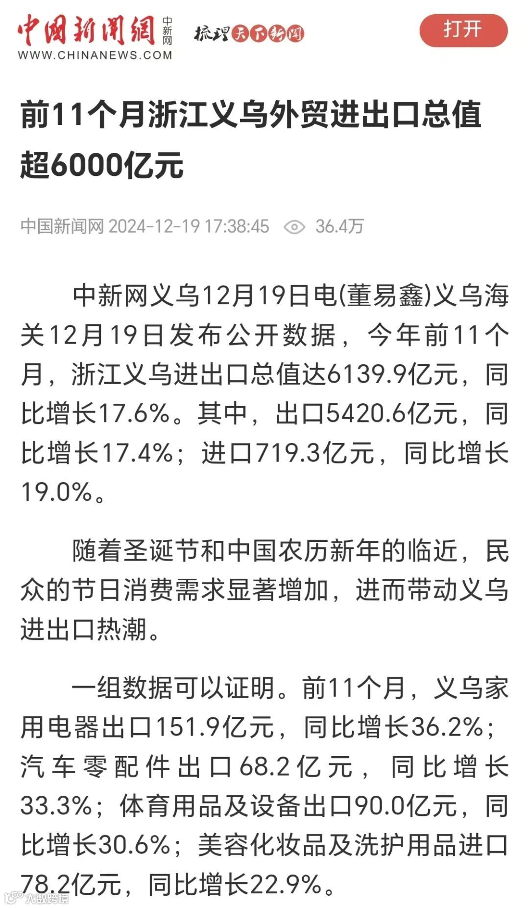 12月20日,中新网客户端报道《前11个月浙江义乌外贸进出口总值超6000亿元》,关注今年前11个月,金华义乌进出口总值达6139.9亿元,同比增长17.6%。