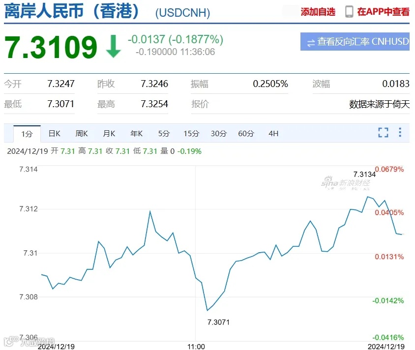离岸人民币兑美元连续跌破7.30、7.31、7.32关口,最低至7.32639,创2023年11月3日以来新低。