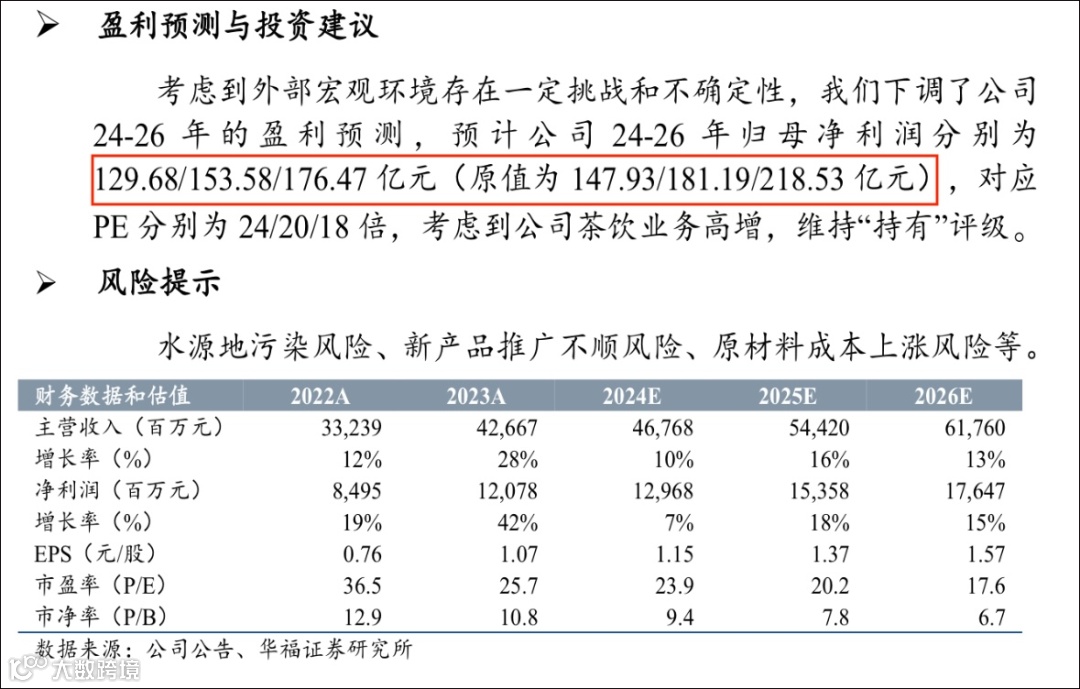 尽管市场看好低价绿瓶利于农夫山泉抢占市场,但这份半年业绩数据交出后,海通国际、光大证券、华西证券、华福证券等券商研报,还是审慎地将农夫山泉2024年全年归母净利润预测值分别下调了2.9%、4.3%、6.1%、12.3%。